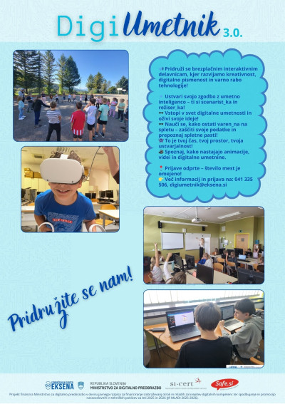 Projekt DigiUmetnik 3.0 je projekt usposabljanja za dvig digitalnih kompetenc med otroci in mladimi širom Slovenije. Za doseganje ciljev projekta bomo izvajali 22-urna usposabljanja varnosti na spletu in delavnic digitalne umetnosti.
